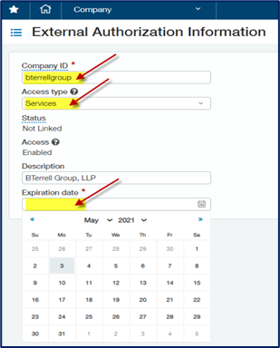 ☐ Nastavte externí autorizaci pro tým Xe a BTerrell s ID společnosti „bterrellgroup“ v testovací společnosti.