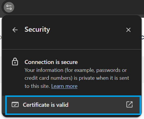 - Vyberte možnost Připojení je zabezpečené a klikněte na možnost Certifikát je platný.